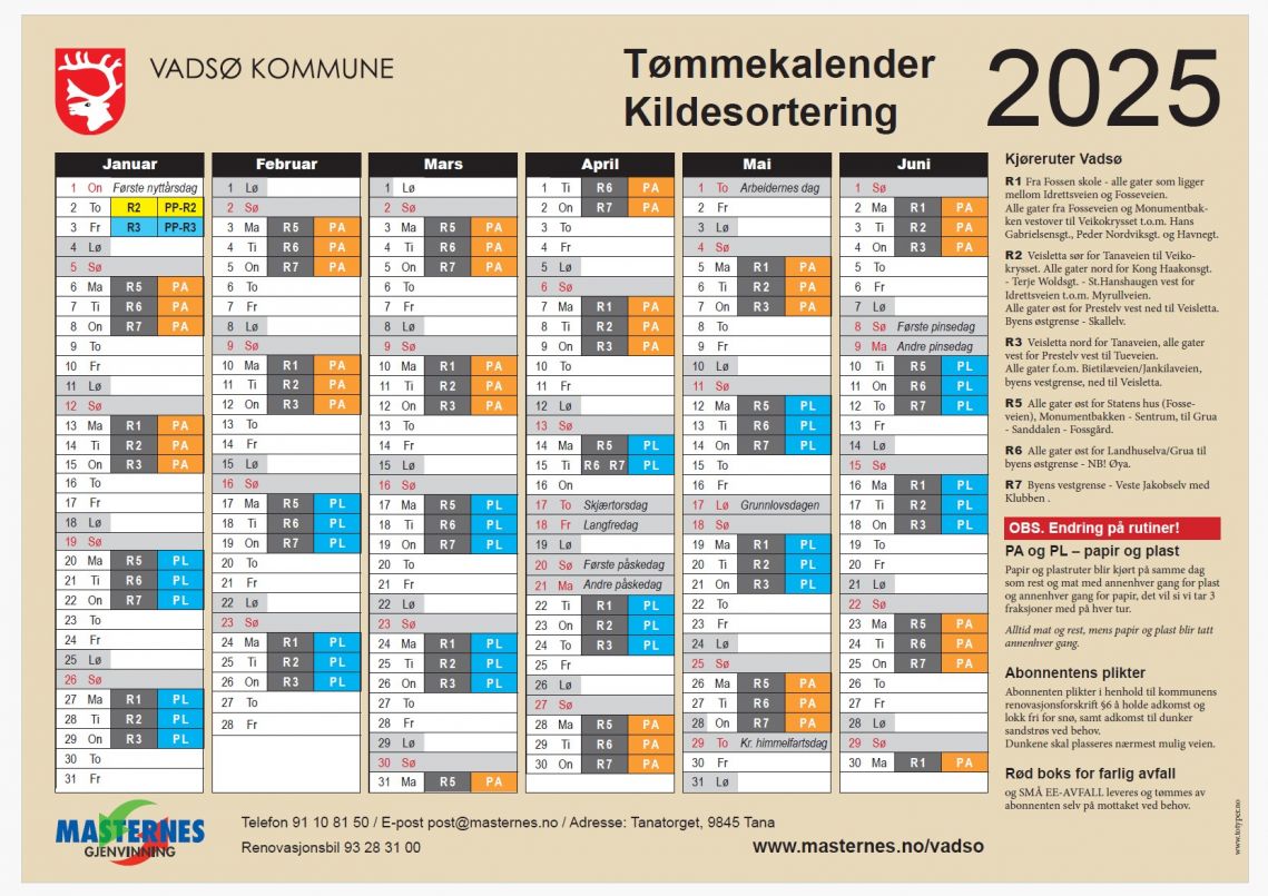 Gjeldende tømmekalender distribueres årlig sammen med aktivitetskalenderen for Vadsø kommune, samt legges ut her og på vår Facebook-side.